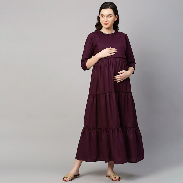 Women Purple Solid Maternity Nursing Empire Midi Sustainable Dress