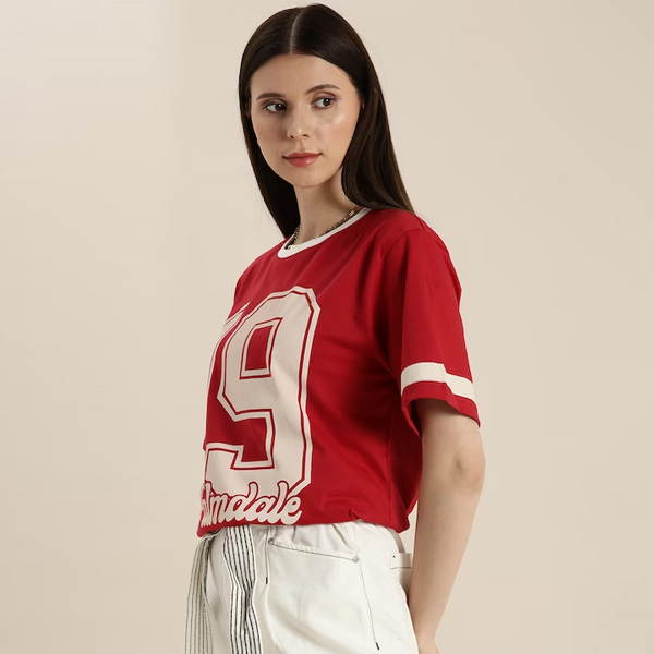 0 review(s) for "Women Red & Beige Typography Printed Pure Cotton Loose T-shirt"