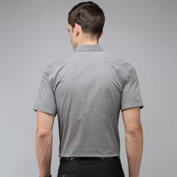 Grey geometric printed opaque Formal shirt, has a spread collar, button placket, 1 patch pocket, short regular sleeves, straight hem